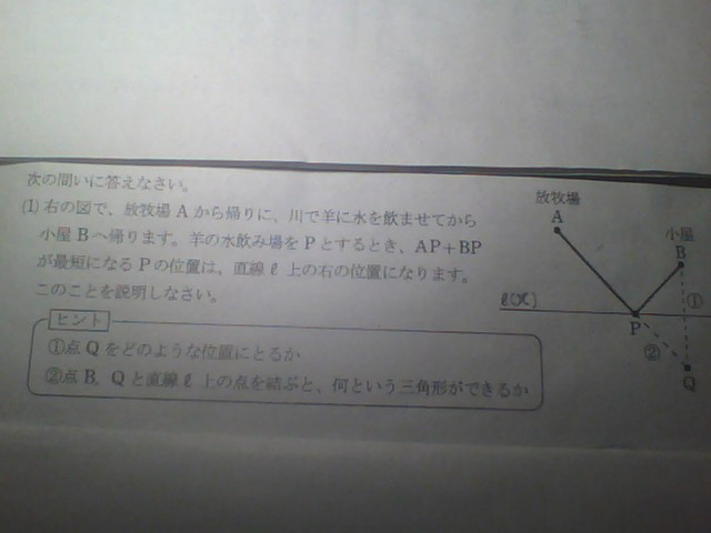 直線lを対称の軸として、点Bに対称な点Qをとる。 PB=PQであるから、AP+PQ が最短となれば、AP+PB も最短となる。 AP+PQ が最短となるのは、点Aと点Qを結んだときであり、線分AQと直線lとの交点点Pを経由するのが最短。