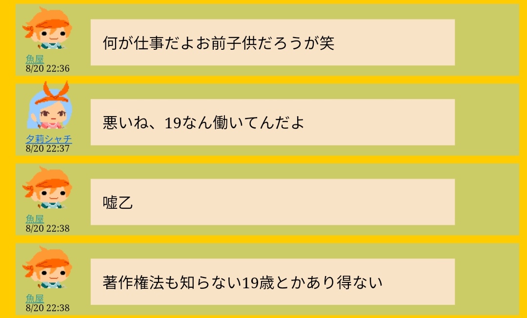 | これは勝手な意見なので無反応で構いませんが、著作権どうこうよりも人が描いた絵とアニメの画像載せてかわいい画像!みたいなコメント付けたり大喜利したりして面白いと思ってるクソガキみたいなユーザーが単純に嫌い ツイッターのバズったツイートに画像リプしてそう [9525] | ||