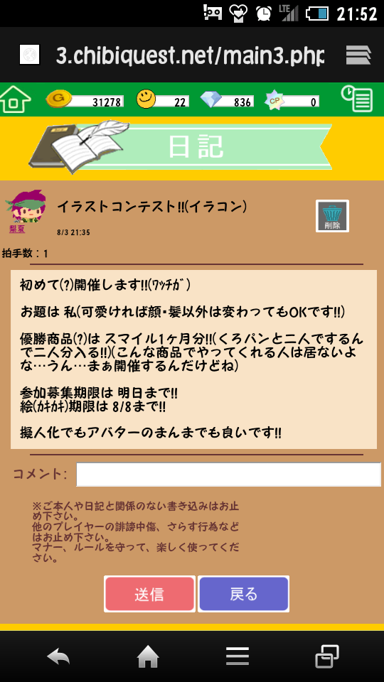 | 僕の日記にてイラストコンテスト第一回を開いております!豪華商品盛りだくさん!あなたも一度書いて見ては? [7133] | ||