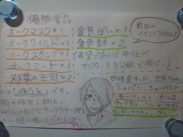 | イラコン開催中です。 日記+ここでも受けつけます。 この投稿に返信(?)する形でお願いします。 〆切は、9/10です。 ![]() [9621] | ||