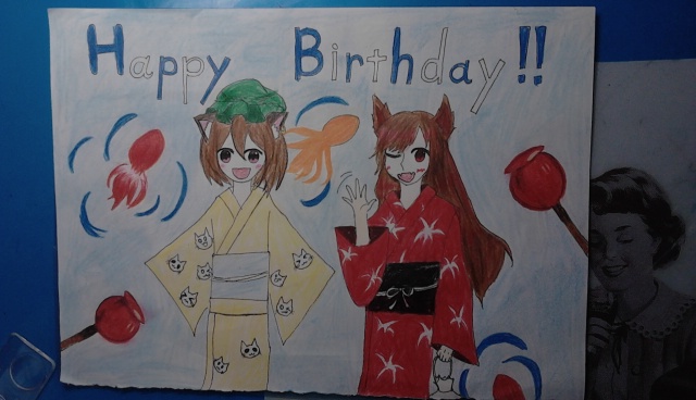| 今月の28日は僕の大親友の誕生日なんです! その誕生日プレゼントに、その大親友が好きな東方のキャラのイラストと手作りのまふてる人形にすることにしました!! イラストは、たった今出来ましたので載せますね〜〃^_^〃 気に入ってくれるかな...? ![]() [6198] | ||