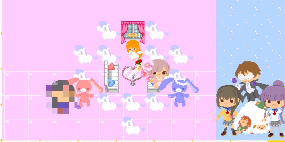 このルームちゃんとストーリーあって、左側が室内で右外なんだけど、この紫の怪盗みたいのが空き巣に入ったから返り討ちにして外で飼ってるのね、でjk達は元々飼ってたから一緒にお外で仲良くしてもらってる、って感じ。冬で寒いから羊で暖とれるようになってる