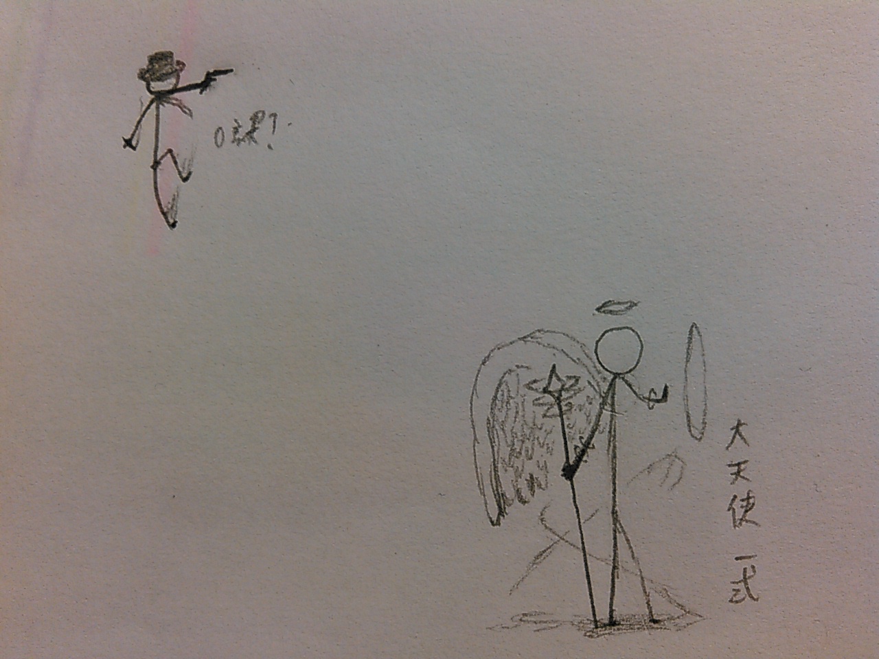 適当に描いた0課と大天使装備の棒人間。