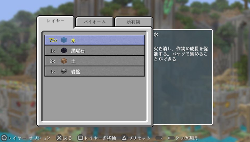 地形は水上で木一本に地面は土4ブロック、チェストの中身は溶岩バケツ1