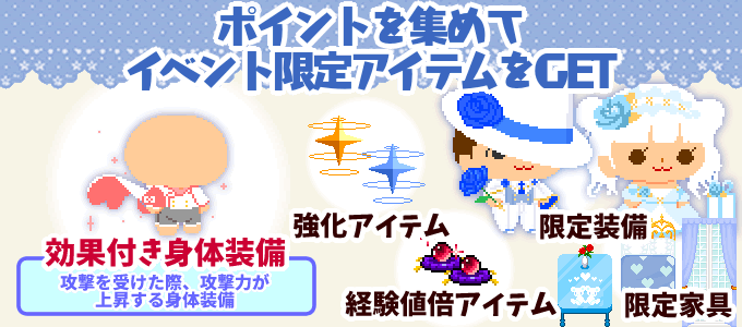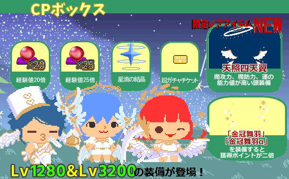 開催期間3月6日〜3月24日9時まで 報酬受け取り期間3月6日〜3月25日9時まで -イベント対象マップ- Lv30「ホイップロード」 Lv230「チョコティーパーティー」 Lv340「マカロード」 Lv1050「アニマルティーパーティー」「アニマルティーパーティー・深」 Lv1860「シュガーガーデン」「シュガーガーデン・深」 ※チョコティーパーティーにはホイップロードからドロップするワープアイテムからワープすることが出来ます ![]() ★イベント限定マップに向かいポイントを集めよう!★ 集めたポイントでポイント達成報酬を受け取ることができます!! ポイント達成報酬は限定装備や、回復アイテム、経験値倍アイテム、星滴のかけらなどが登場! ※効果付き身体装備の装備可能レベルはLv100となります ![]() ![]() 今回のボックスは、天使をモチーフにした装備が入っています! 大当たりは「魔攻力、魔防力、運の能力値が高い頭装備」です!! +300まで強化されたものが入手でき、装備すると獲得ポイントが3倍に! また、「金冠舞羽」「金冠舞羽α」を装備すると獲得できるポイントが2倍! 11連のおまけは「経験値×30」です! ※装備は+100まで強化されたものが入手できます ※ポイント倍装備は今回のイベントのみの効果です 販売期間は3月6日〜3月24日9時まで
